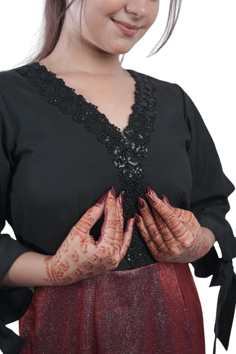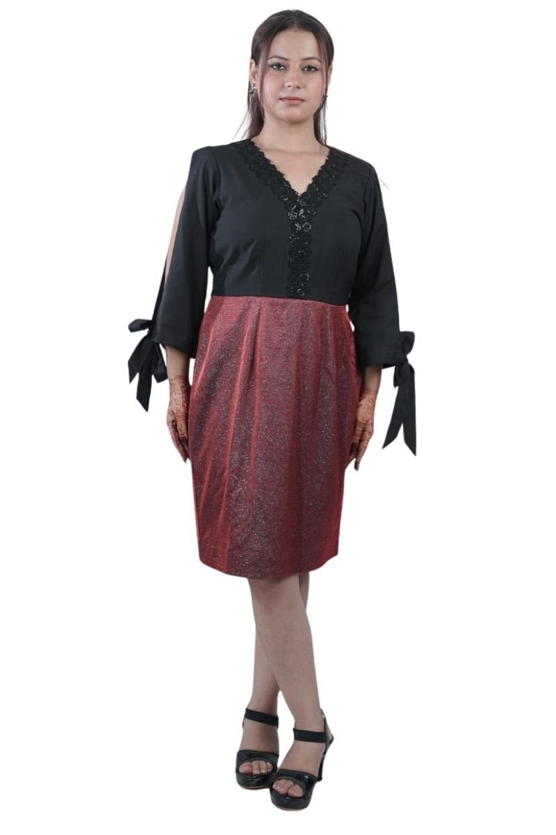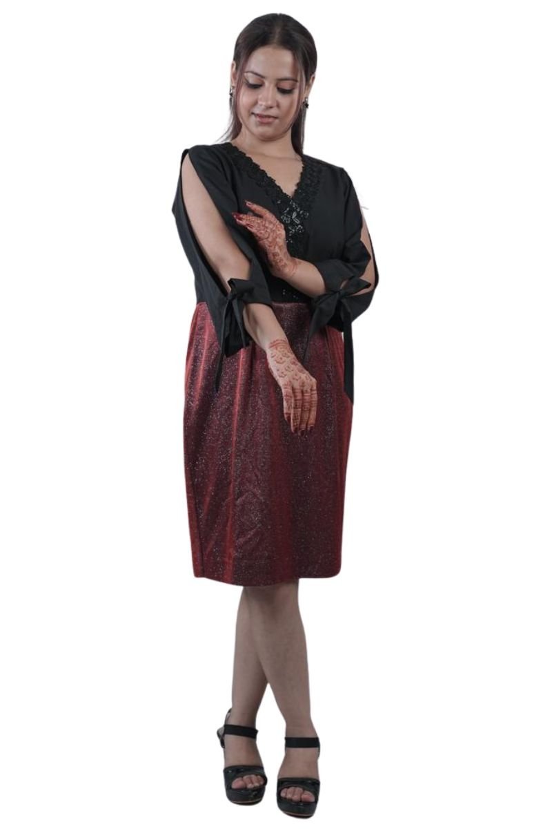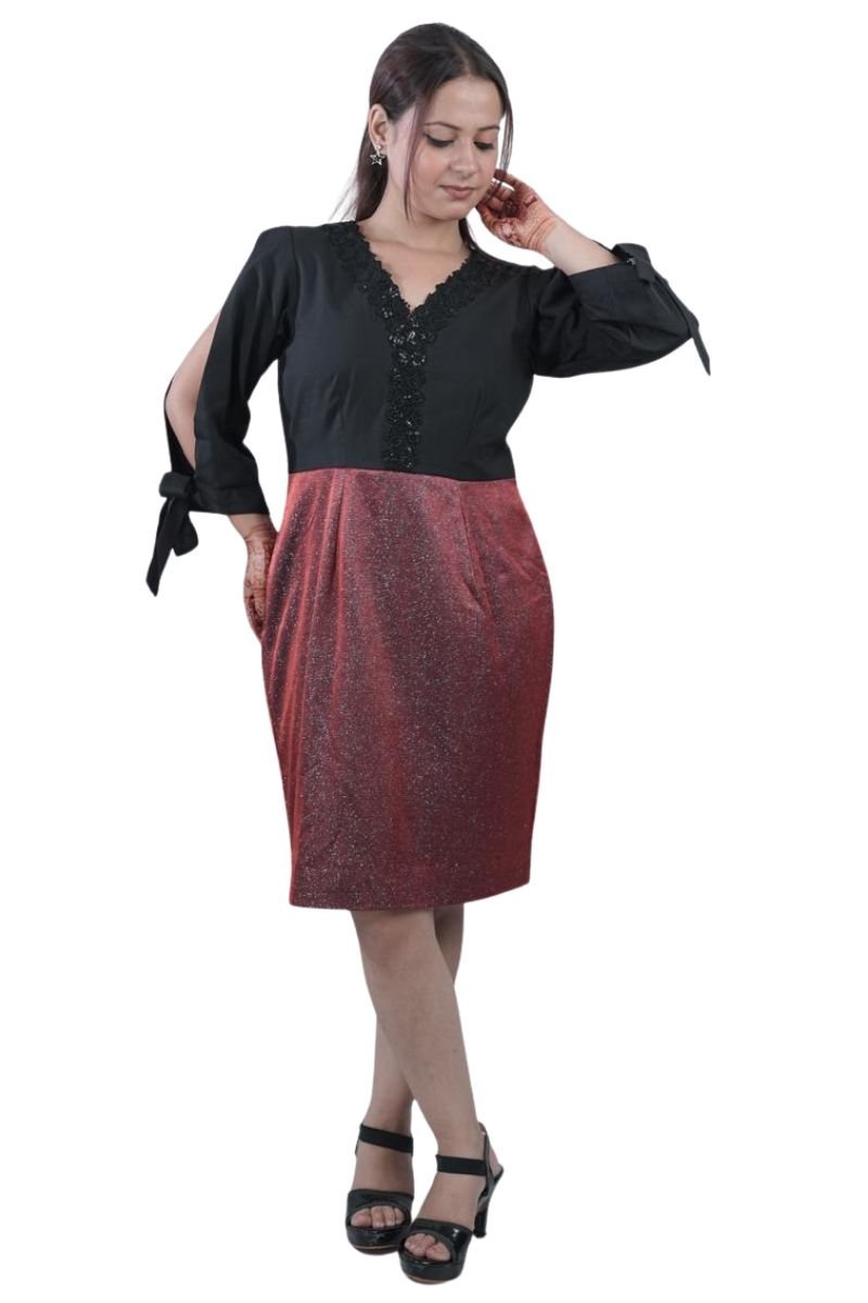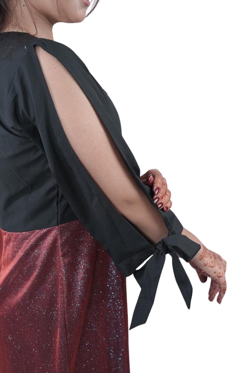 Elegant black and red shimmer dress with statement sleeves and lace detailing.