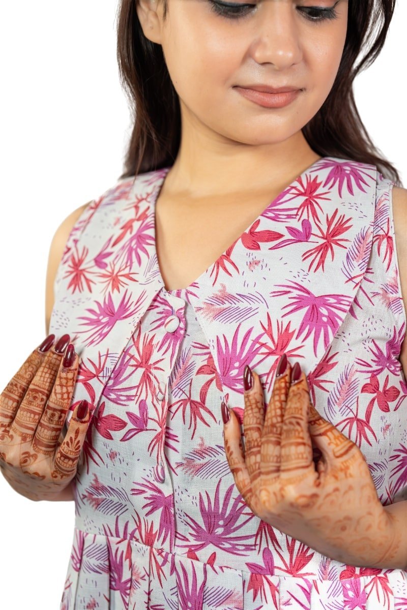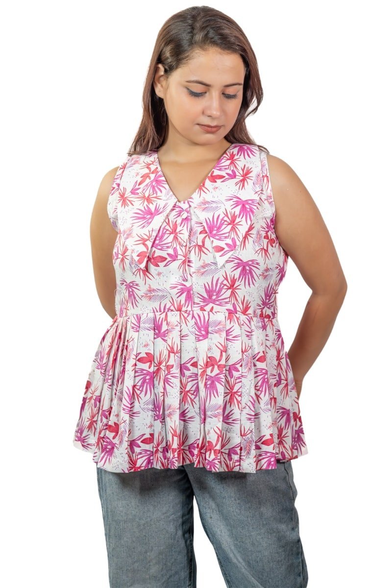 Breezy sleeveless cotton top with pink tropical prints and flared hem.
